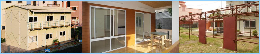 These are modular structures made from steel structures, roof and walls made from reusable materials, such as sandwich panels which are made up of EPS (Expanded Poly Styrene) pre-coated steel. Sliding Windows made from aluminium/PVC, locations of these windows & doors are customizable according to the site requirements.